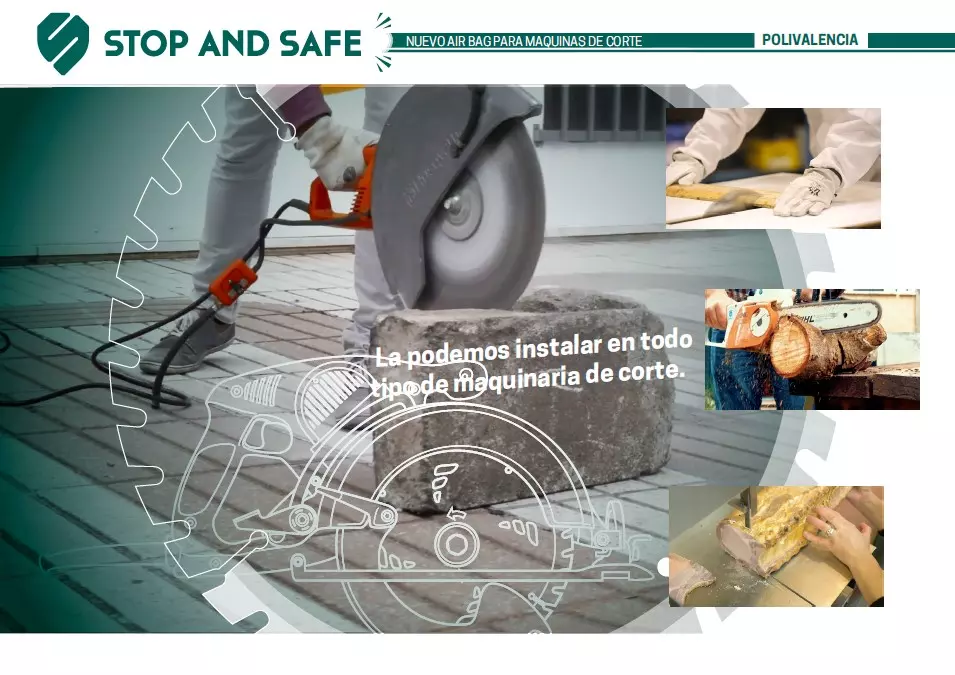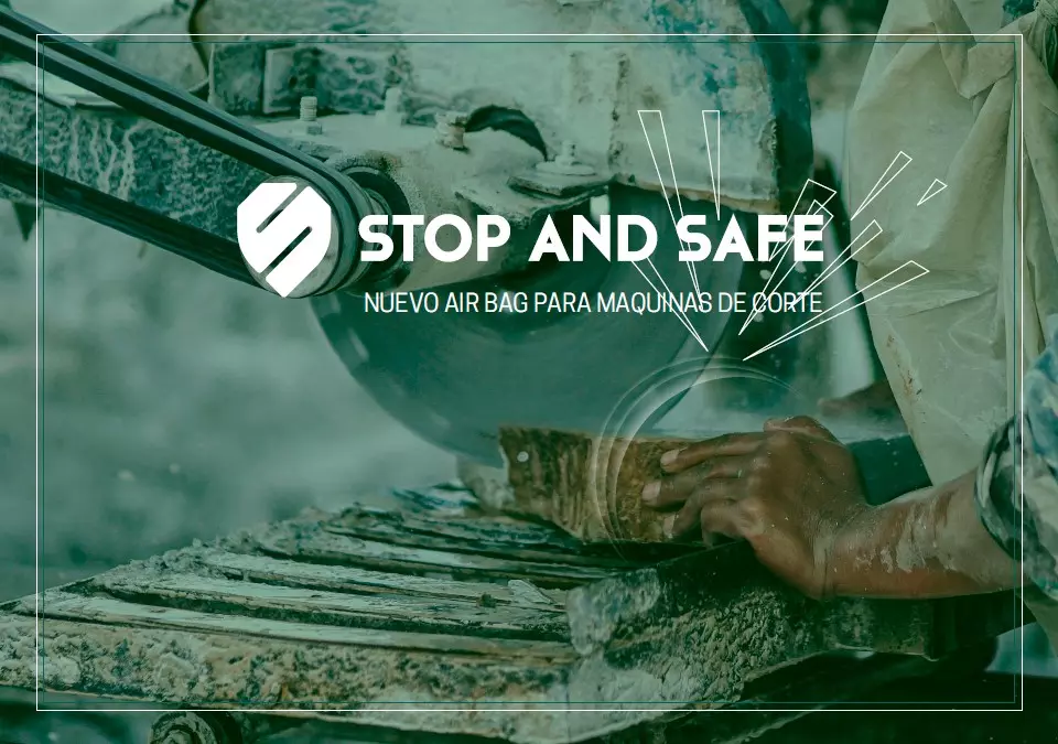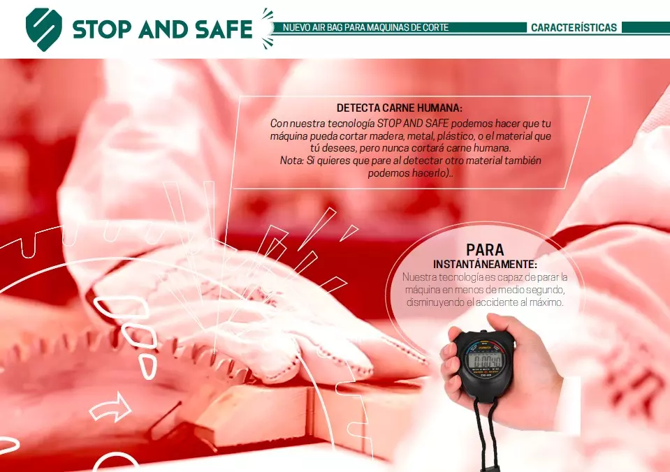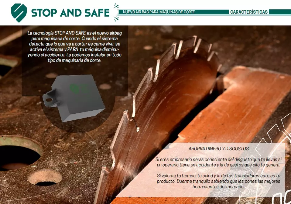 La tecnología STOP AND SAFE es el nuevo airbag para maquinaria de corte. Sirve para la prevención de riesgos laborales de cortadoras, motosierras, radiales y cualquier máquina de corte.  Cuando el sistema detecta que lo que va a cortar es carne viva, se activa el sistema y PARA tu máquina disminuyendo el accidente. La podemos instalar en todo tipo de maquinaria de corte.