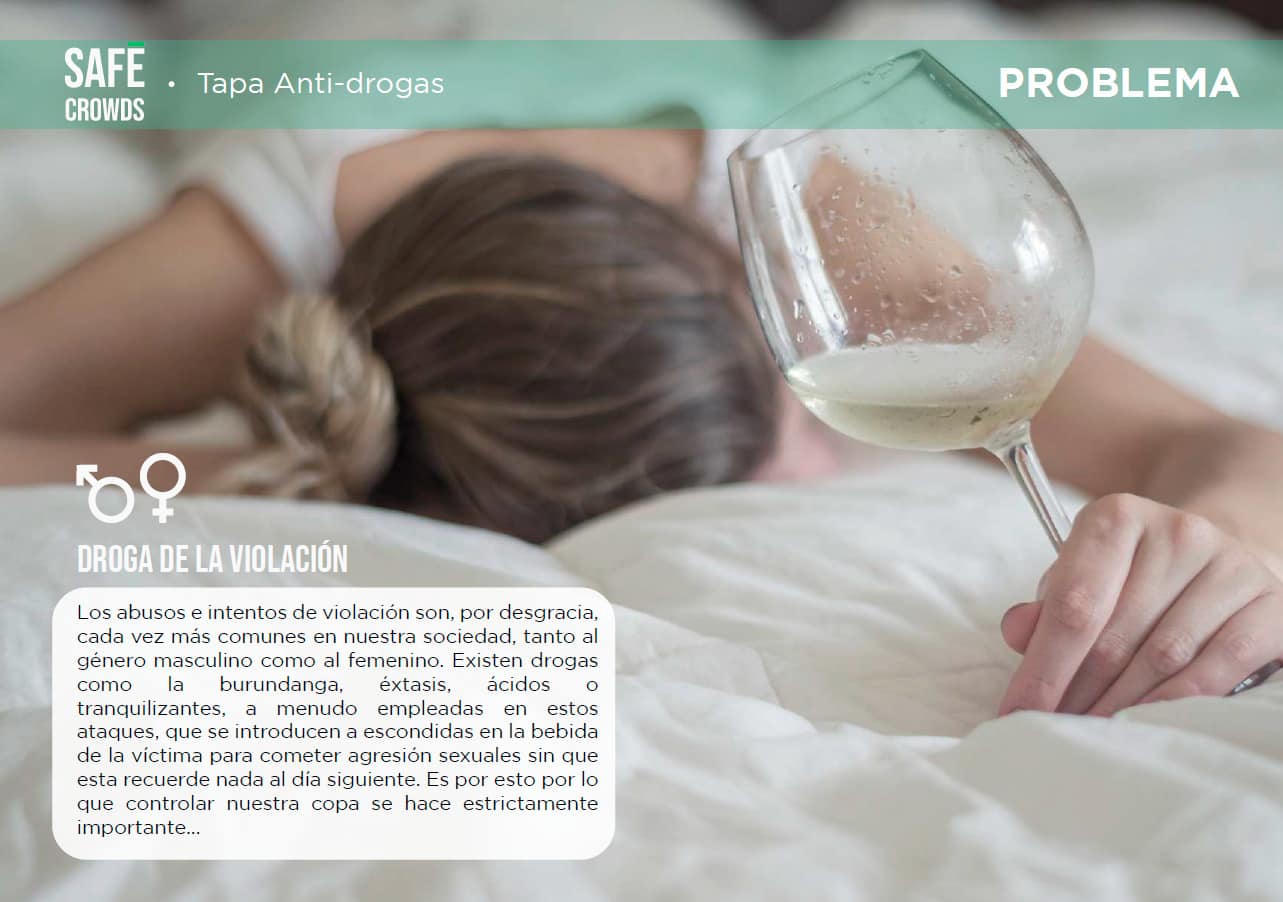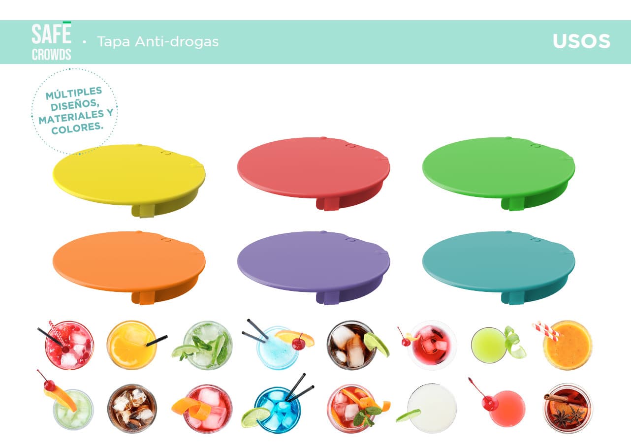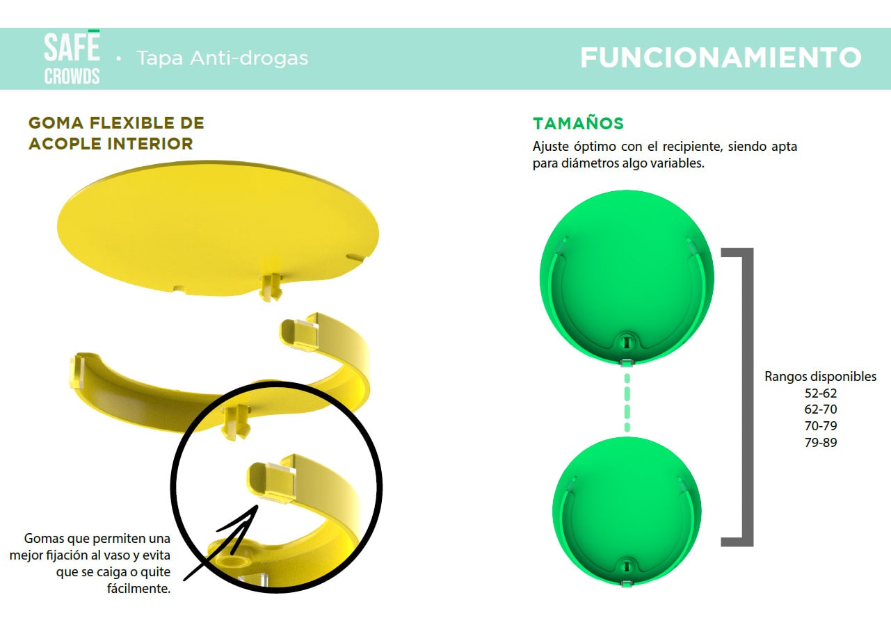 Es un dispositivo que evita dicho problema en grandes multitudes o aglomeraciones como fiestas o eventos especiales. También evita la introducción de gotículas, eliminando la posibilidad de contagios a nivel general. Se trata de una tapa a modo sistema de seguridad que evitará que el atacante deposite cualquier tipo de sustancia en el interior de tu bebida. No obstante, dicha tapa será fácilmente manipulable para que el usuario no tenga que realizar demasiada maniobra para beber y, además, no se perderá el tacto con el propio recipiente, quedando siempre protegido.