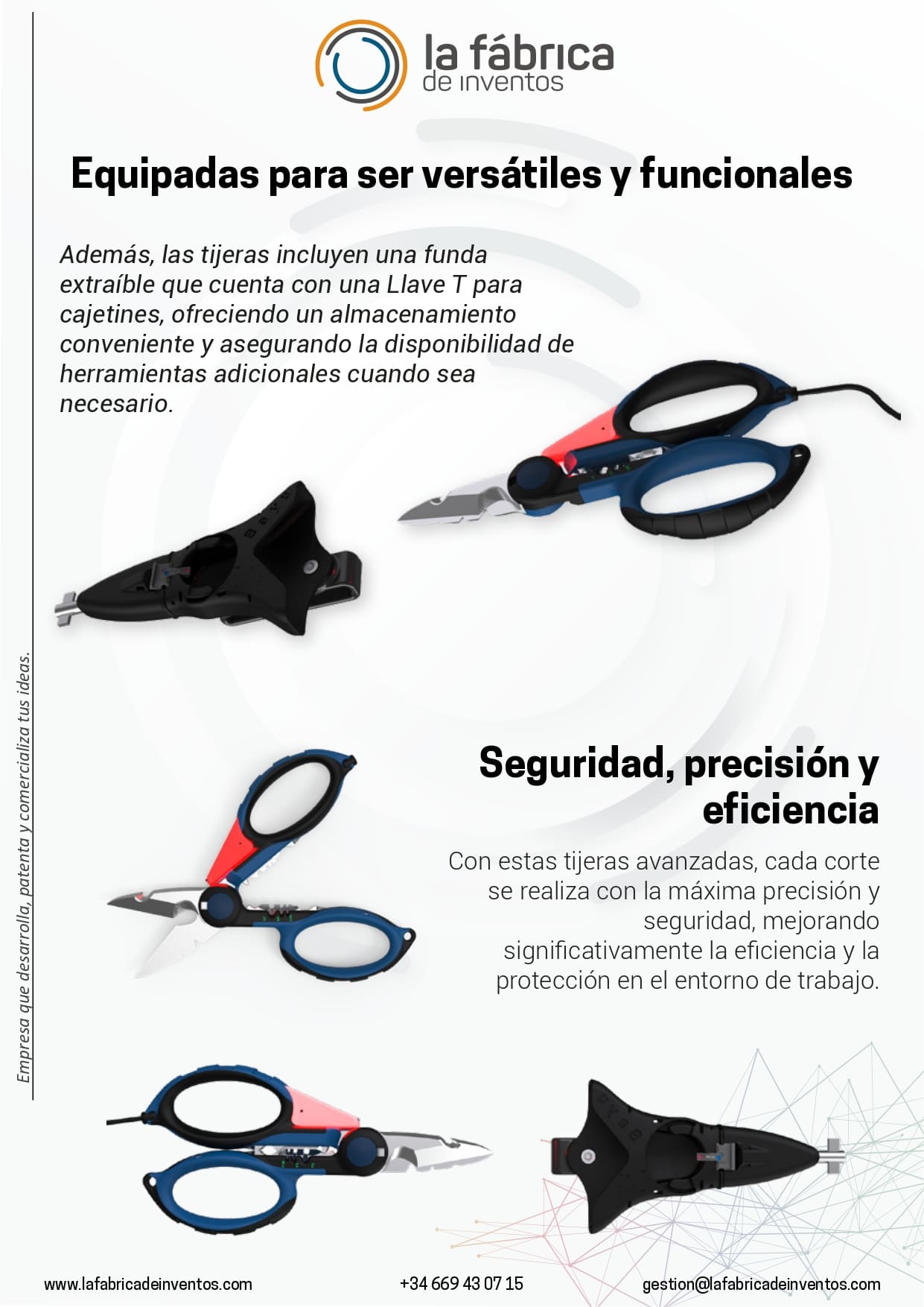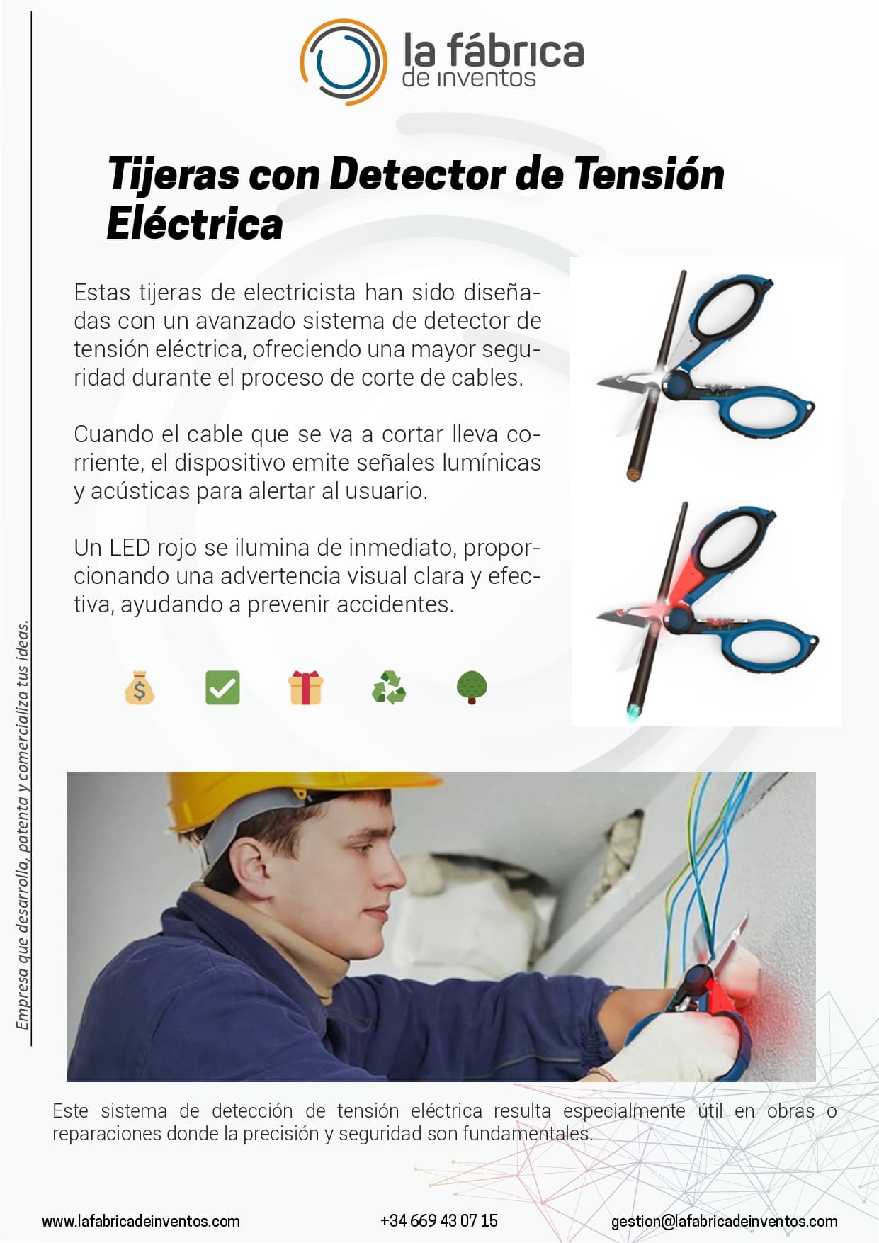 Si quieres más información acerca de las tijeras con detector de tensión o cualquiera de nuestros servicios, ya seas inventor, inversor o empresario pincha en el botón de Contáctanos.
