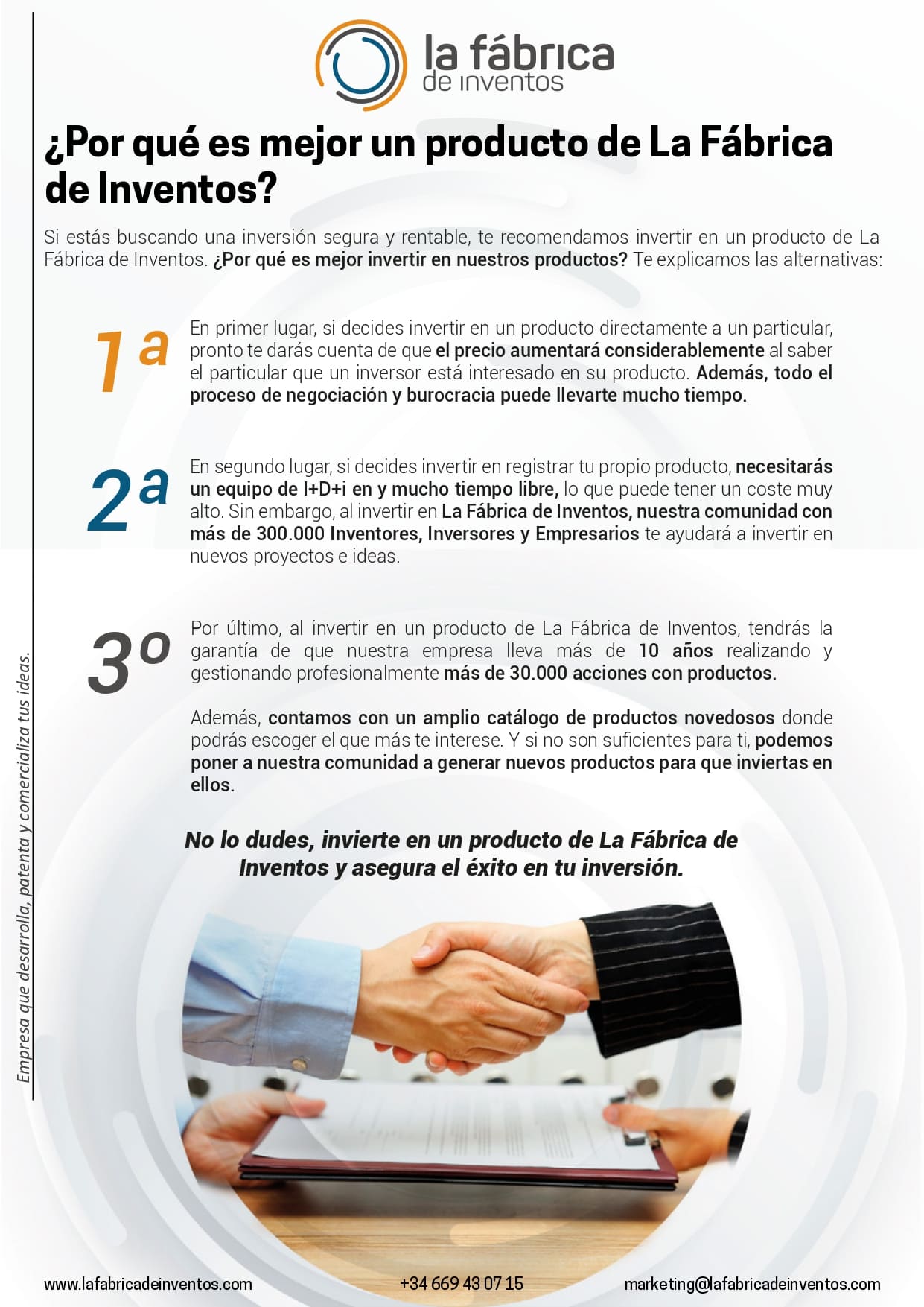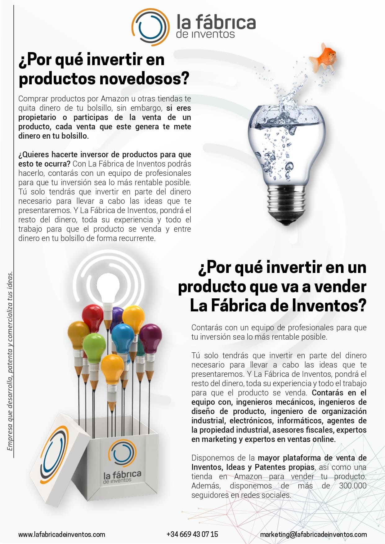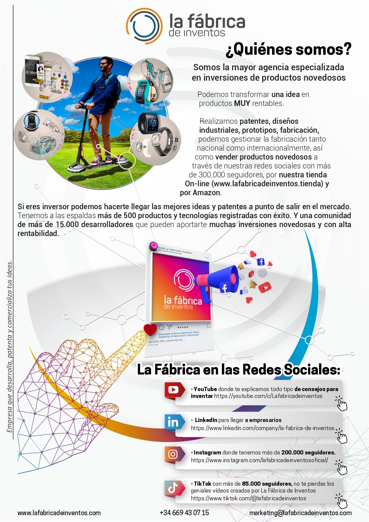 La Fábrica de Inventos cuenta con un equipo de ingenieros, diseñadores, abogados y expertos en marketing altamente capacitados y experimentados en el desarrollo y lanzamiento de nuevos productos.